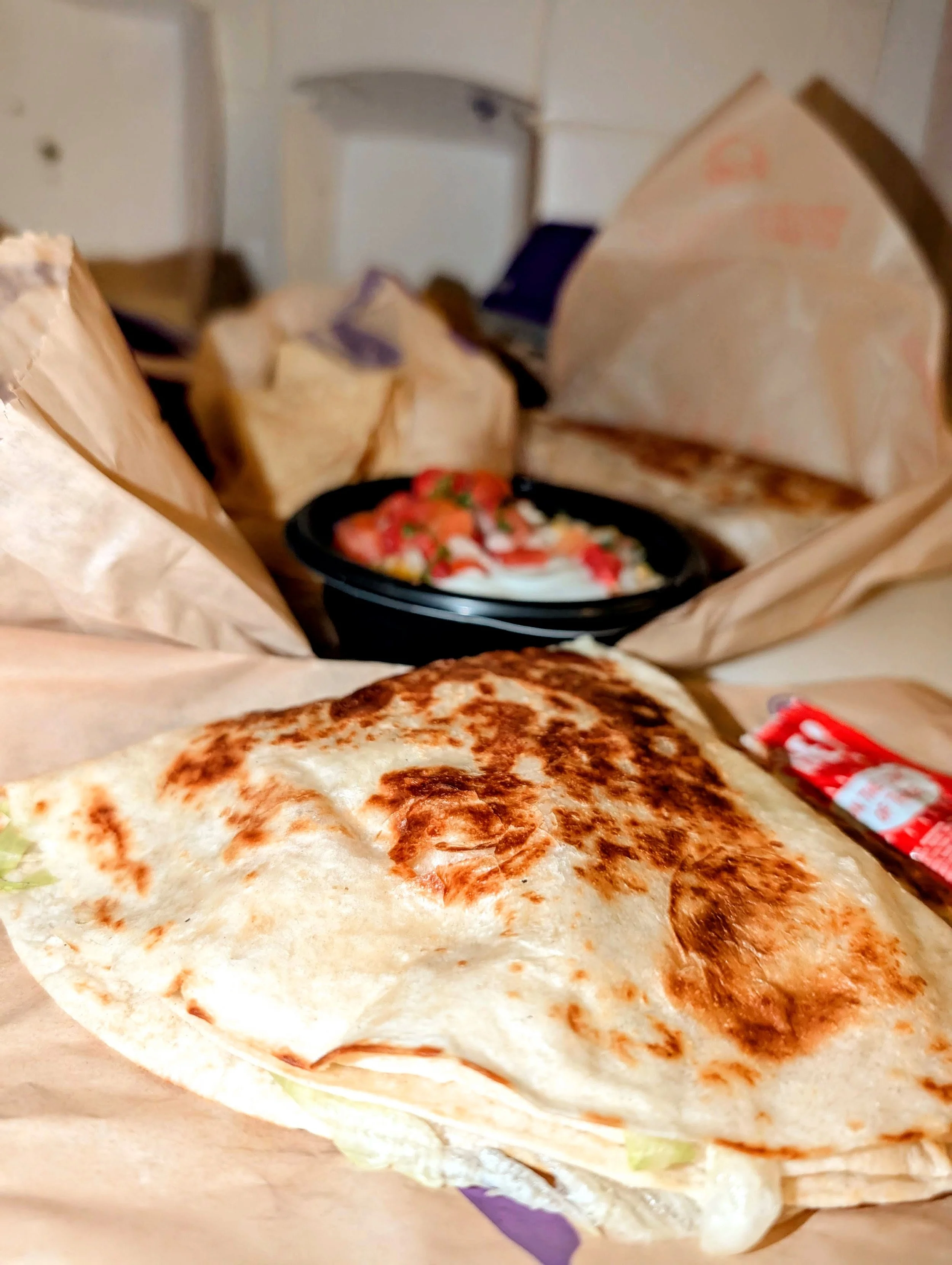 The textures blur together into a molten, savory mass that hits every pleasure center at once: salty beef, creamy sauces, crispy potato edges. If you wanted to zhuzh it, you could add jalapeños or tomatoes for contrast, but part of the charm is how committed it is to its own soft, cheesy worldview. This is a brick of meat and potatoes burrito that knows exactly who it is, and that person is extremely comfortable ordering “extra sauce.”
