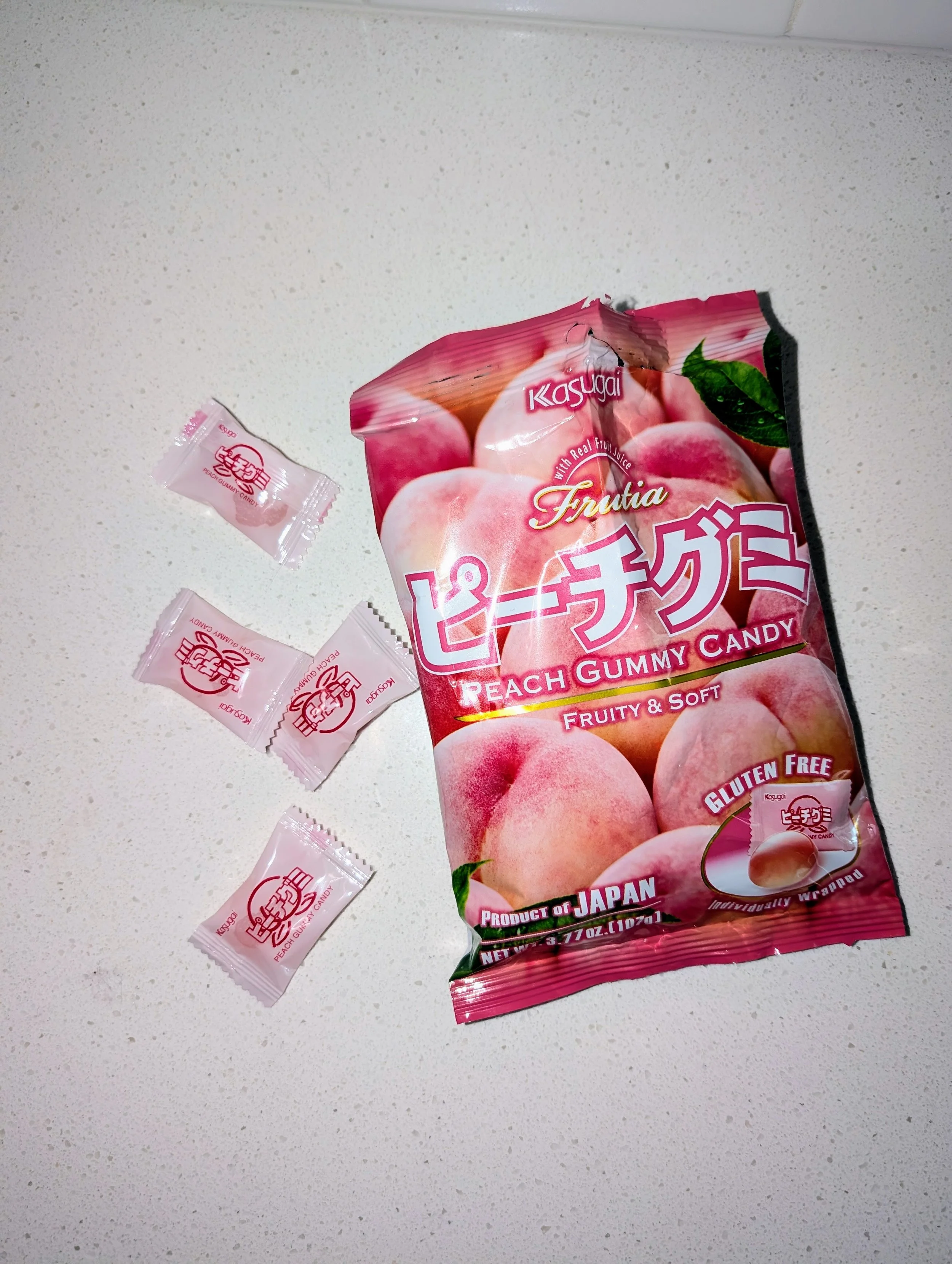 The range runs from the expected (peach, grape, strawberry) to the quietly sophisticated (muscat, yuzu, lychee, Japanese melon), each variety individually wrapped: part portion control, part evidence trail. The peach version sits comfortably at the center of the lineup: soft, fragrant, and so convincingly orchard-adjacent that opening the bag releases a cloud of scent strong enough to suggest you may now own land.