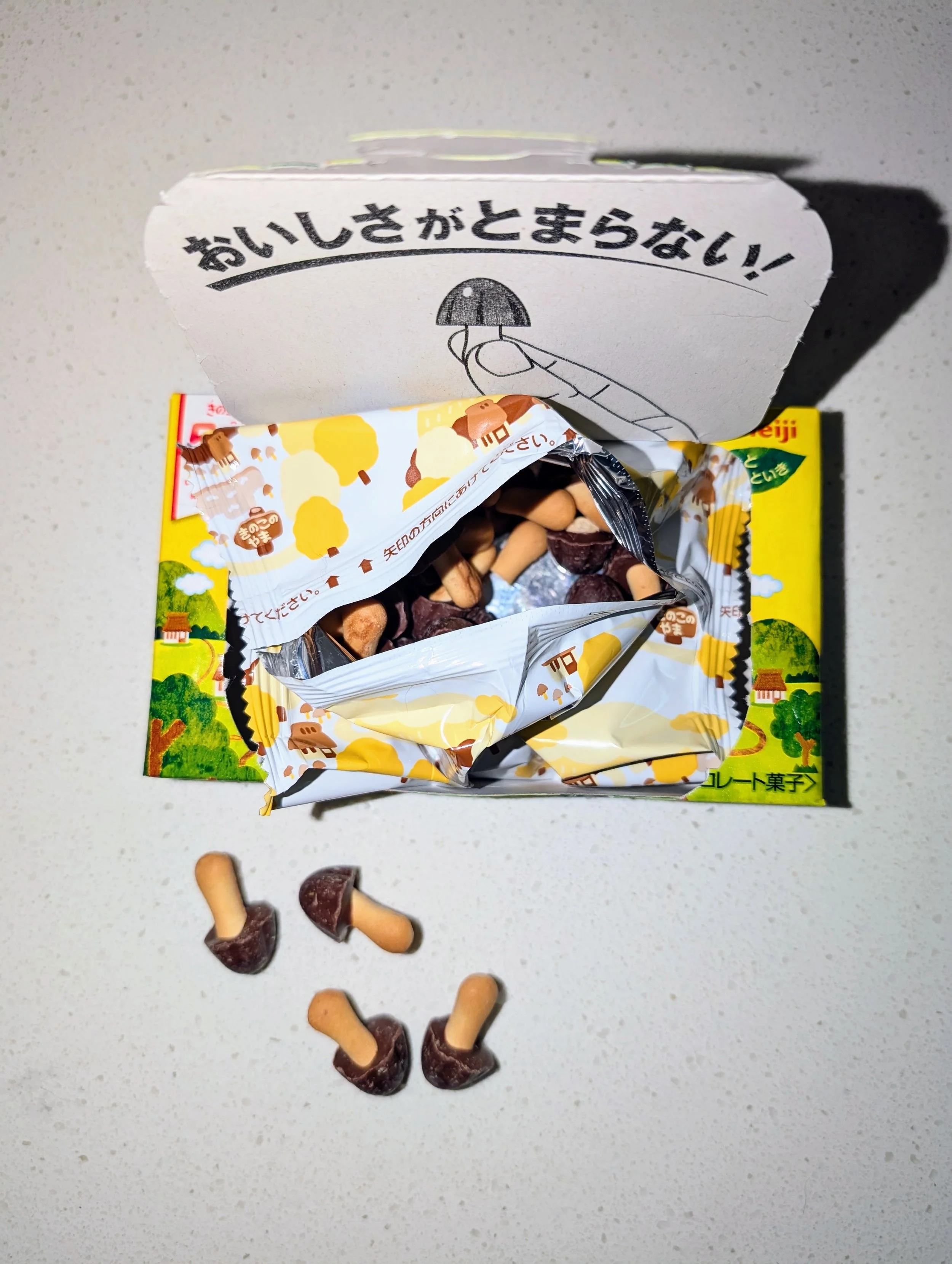 The mushrooms proved popular enough to inspire a sister product, Takenoko no Sato, Village of Bamboo Shoots, and with it a long-running, good-natured rivalry among fans. Mushroom people versus bamboo people. Structure versus structure. Texture loyalty as a lifestyle choice.